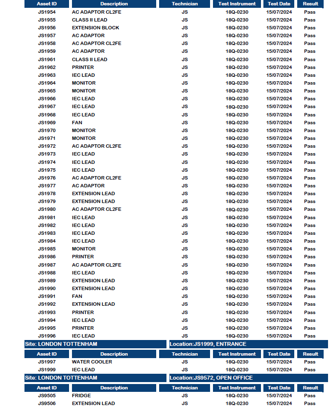 We supply pdf reports detailing a comprehensive appliance list and PAT certificates for compliance assurance.